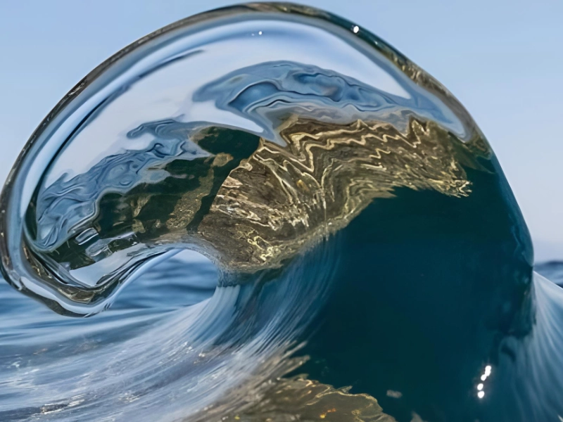 この波は、波が頂点に達する直前に撮影されたため、ガラスでできているように見えます。それは写真家によって完璧に捉えられており、波がどのように浅瀬で構成されているかが非常に明白です。