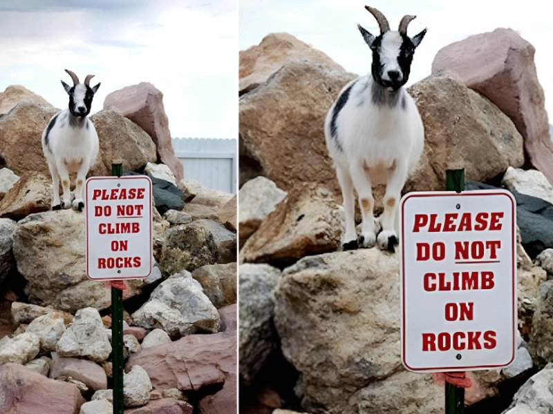 「石から落ちないように注意してください。」この標識にも同様のことが書かれていますが、投稿者にとって悲しいことに、ヤギは読み書きができず、それがこのヤギが岩の上の席から怒って見つめている理由の説明になっています。