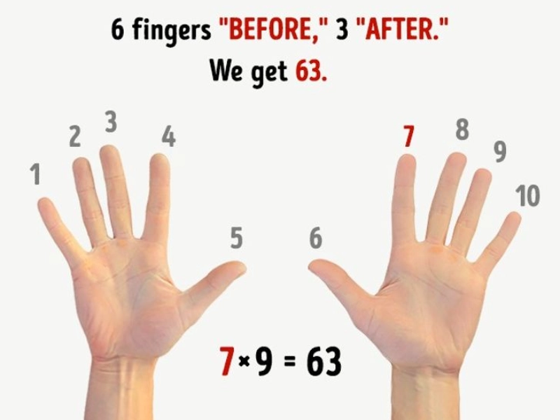 指をまっすぐに伸ばし、手のひらを下に向けてテーブルの上に手を置き、9 を掛けます。次に、9 を掛けたい量に対応する指を曲げます。「前」の指は 10 を表し、「前」の指は 10 を表します。「後」の指、単位。たとえば、7 × 9 を掛けながら 7 番目の指を曲げます。「前」の指は 6 本、「後」の指は 3 本のままです。解は79×63です。