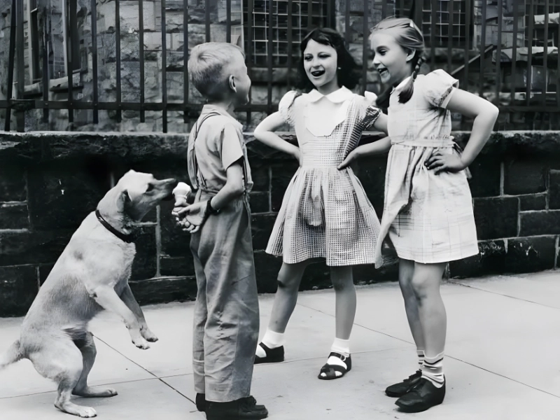 このかわいい写真は、男の子にとって最大の不安の原因は 2 人の女の子と会話することであった子供時代の幸せを捉えています。あの気ままな時代!この写真は、すべてのオスが人生で一度か二度経験したことがあるこの象徴的な瞬間を捉えているだけでなく、その瞬間に夢中になりすぎて、愛犬がこっそりおやつをくれるのを見逃してしまう可能性があることも示しています。