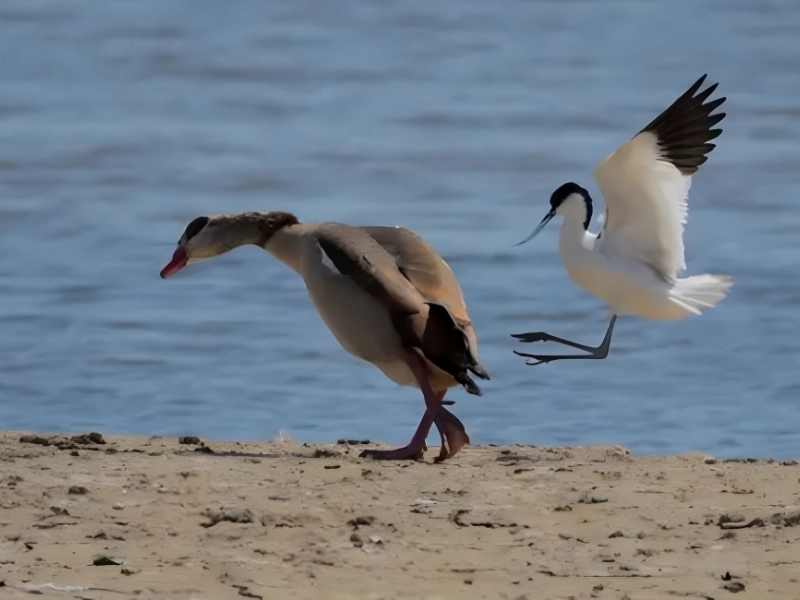 同じような鳥が群れることもありますが、この 2 羽はどうでしょうか。バードパーティーの真髄を見せてくれています!左側には、特徴的な動きである「空に向かって急降下」をしている優雅な白鷺が見えます。その間、決意を固めたアヒルは右側で伝統的な「レイクサイドランジ」を実行します。