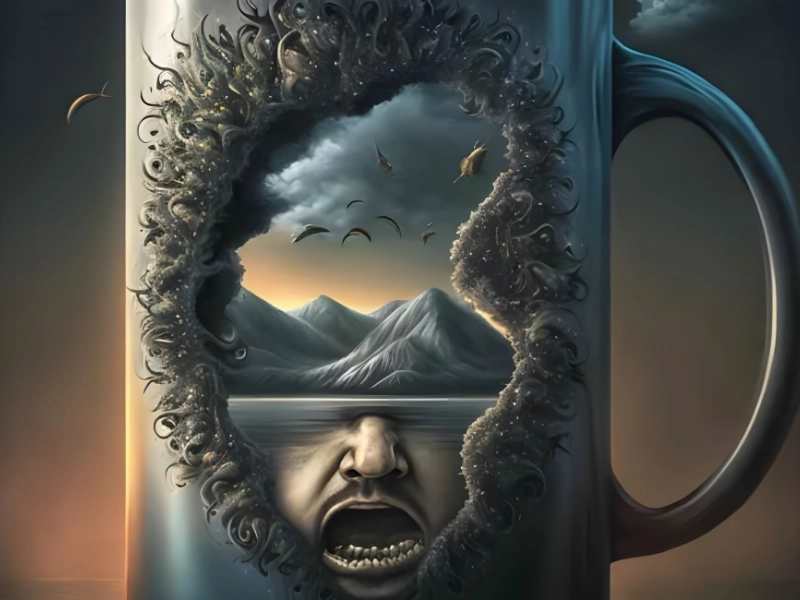 朝のコーヒーをシュールな風景と一緒に楽しみたいと思いませんか? AI アートならそれが可能です。おそらく今キッチンの戸棚にあるような、ありふれた大きなコーヒーカップが、この画像の外側の「フレーム」になっています。