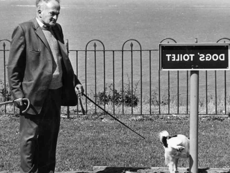 画像にビンテージの外観を与えている男性のコートと白と黒の輝きが、この写真に古い雰囲気を与えています。しかし、ここの主な魅力は人間ではなく、割り当てられた場所を使って用を足す訓練された犬です。