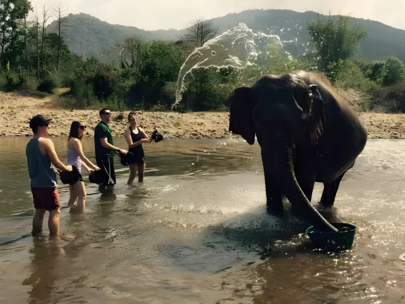 この画像は、本物のアフリカ旅行がグループ チャットの外で行われた場合にどのようなものになるかを示しています。さわやかな小川の中で仲間たちと立って、あなたと同じように水浴びをしている人懐っこいゾウに向かって水を投げる静けさを想像してみてください。
