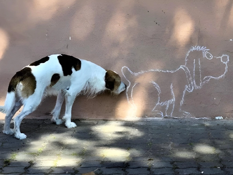 もちろん、動物は犬であると仮定します。この犬は、壁にチョークで描かれた絵に少し困惑し、二次元の仲間の匂いを嗅ぎ分けようとしていますが、失敗しています。もしかしたら、その犬はその輪郭に少し驚いたのかもしれません。あるいは、私たちの仲間である犬の鼻は本当に強力なので、さまざまな次元にある物体を認識できるのかもしれません。
