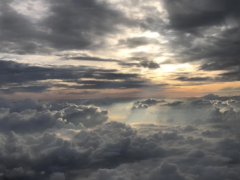 この素晴らしい写真は幻想的に見え、飛行中に撮影できる息を呑むような風景の例です。雲海が夕日に照らされ、幻想的で幻想的な景色を作り出します。