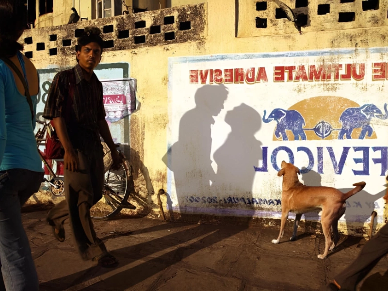 この写真は、決して起こらなかった甘い瞬間を示しています。おそらくデジタルカメラで撮影されたと思われるこの写真の男性と女性は、後ろの壁の影のせいでキスをしようとしているように見えます。しかし、すれ違う様子からすると、彼らが現実世界では他人であることは明らかです。