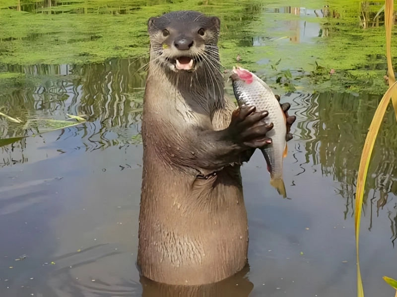 ご覧のとおり、懸賞に応募されたこのカワウソは、魚釣りをしているときに人が話しかけてくるのを嫌がります。カメラをにらみつけながら、大きな前足の間にある物体を守るために小さな牙を突き出しています。