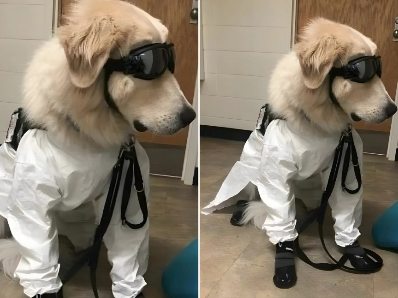 これらの犬は、最初に安全装備を装着する必要はあっても、出かける準備ができています。 この写真では、犬が飼い主の学校の実験作業を手伝う準備ができています。 彼はとてもプロフェッショナルに見えるので、おそらくデュポンのトップ サイエンティストなのかもしれません。