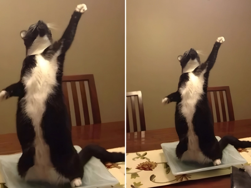このモノクロの猫は、1980年代のようにパーティーをする準備ができており、音楽を心から楽しんでいます。踊っているように見える猫のこの愛らしい写真は、急いで撮影されました。