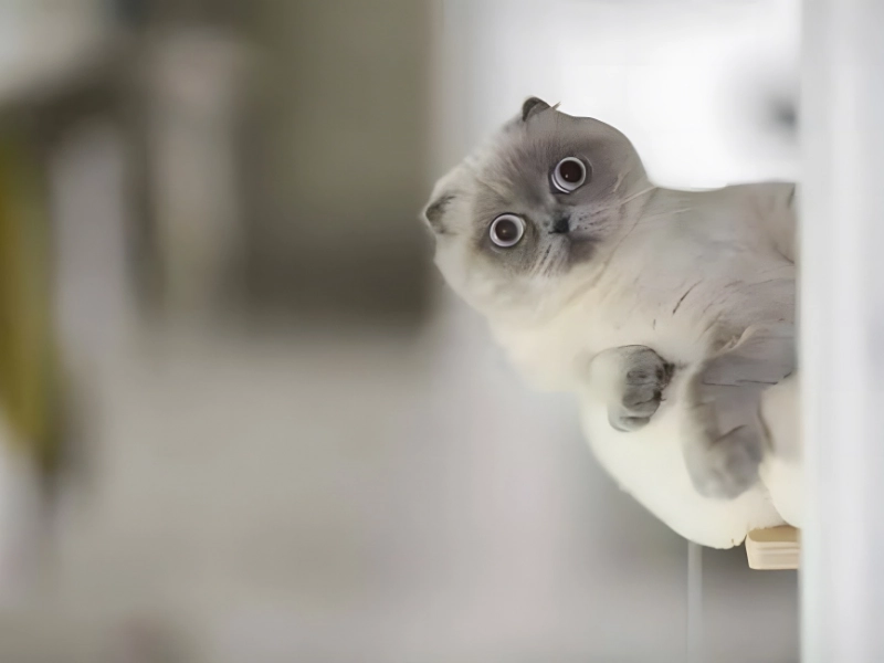 この小さくて大きな目をした猫は、罪悪感と不快感の両方を感じており、それを表現しているようです。彼の精神は明らかに混乱しており、飼い主に延長コードをかじったり、その他の悪事を働いているのを見られないように願っています。