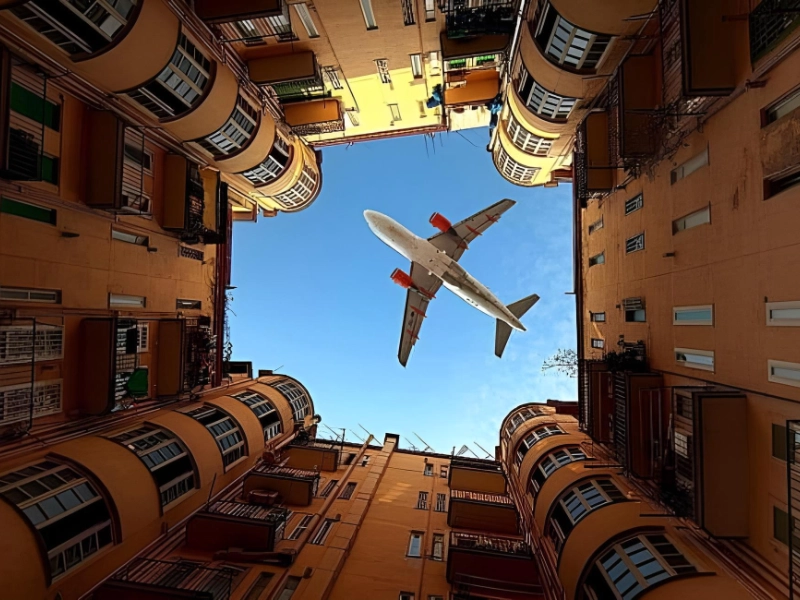 この画像は、地球と陸地の違いを効果的に捉えており、アパートが建つ魅力的な建物の中に飛行機が写っています。シュートのタイミングが絶妙ですね。この絵はあまり知られていませんが、コントラスト、バランス、美しさの点で傑作です。したがって、次回飛行機が上空を飛行するときは、ためらわずにカメラを手に取ってください。