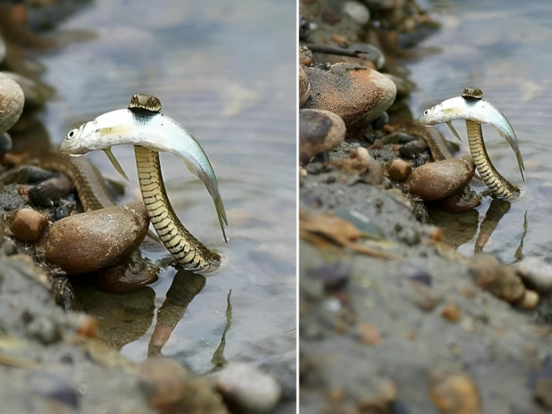 ヘビを最も恐れる私たちでさえ、これが一種のかわいい写真であることを認めざるを得ません。この小さなヘビは、小さな魚を捕まえた後、とても満足しているようでした。興味深いことに、ほとんどのヘビは通常魚を食べません。