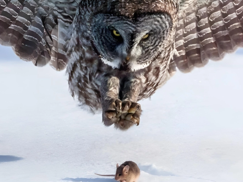 今にも小さなネズミを捕まえようとするフクロウのこのイメージは、さまざまな感情を呼び起こします。画面を通して、フクロウの力強さと素晴らしさ、そしてネズミの潜在的な恐怖を感じることができます。