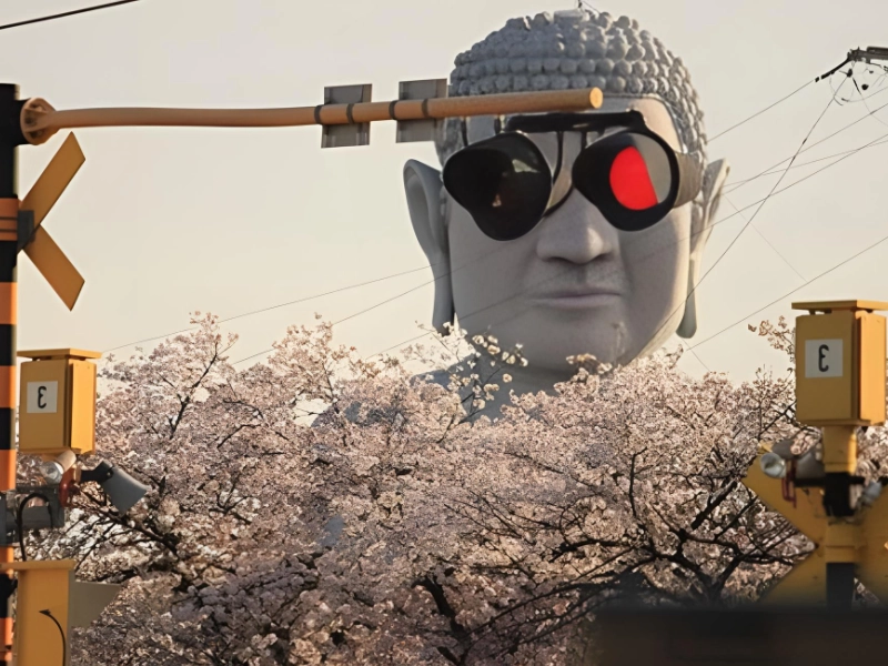 この例では、写真を撮った身元不明の人物が、古代文明の要素と、人気のある丸くてつばの広いサングラスの Z 世代スタイルを組み合わせました。この像は完璧に傾いているように見えますが、実際にはサングラスに見せかけた交通安全灯の数マイル後方にあります。見事な桜の花がさらに美しく映えます。