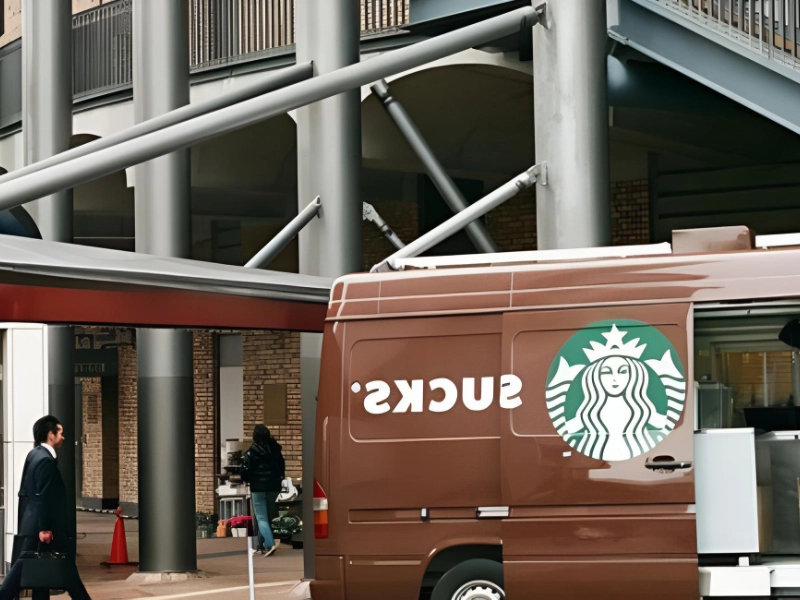 この画像は、よく考えられていないアイデアをユーモラスに、そしてタイミング良く描いたものです。気づかなかったかもしれませんが、この配送車両は世界的に有名なコーヒー会社、スターバックスが所有しています。しかし、バンのスライドドアはブランド名の「tarb」の文字を隠し、後ろに「S」と「ucks」だけを残しているようです。そしてそれらを組み合わせると何が得られるでしょうか?”ひどい。”