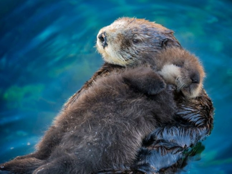 ラッコの子は母親の上で寝ます。