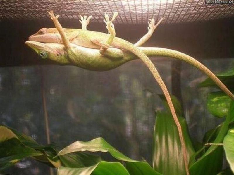 「この雄のトカゲは、雌がその上で寝られるよう、ケージの上部にしがみついています。」
