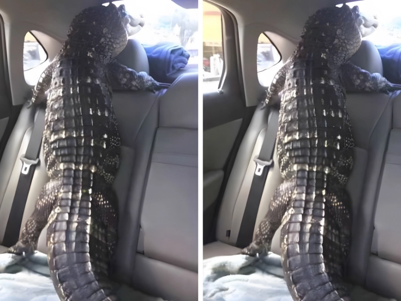 の背景が何なのかわかる人はいますか? このワニはどうやって後部座席に乗り込んだのでしょうか? これはどこで撮影されたのでしょうか? このワニを後部座席に乗せるのは違法なので、注意が必要です。このワニの「飼い主」には説明すべきことが山ほどあります。