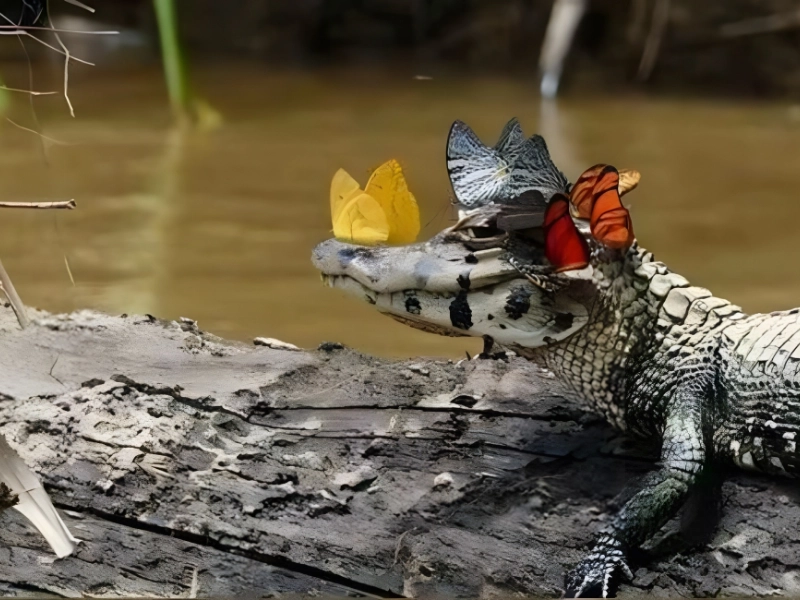 ワニに美しさはあり得ないなどと誰が言ったのでしょうか。このワニは、見た目は恐ろしいかもしれませんが、必ずしも恐ろしいわけではありません。コミュニティでは評判が良いようです。ワニ自身も日光浴をしていますが、蝶が集まっているのを見てください。R