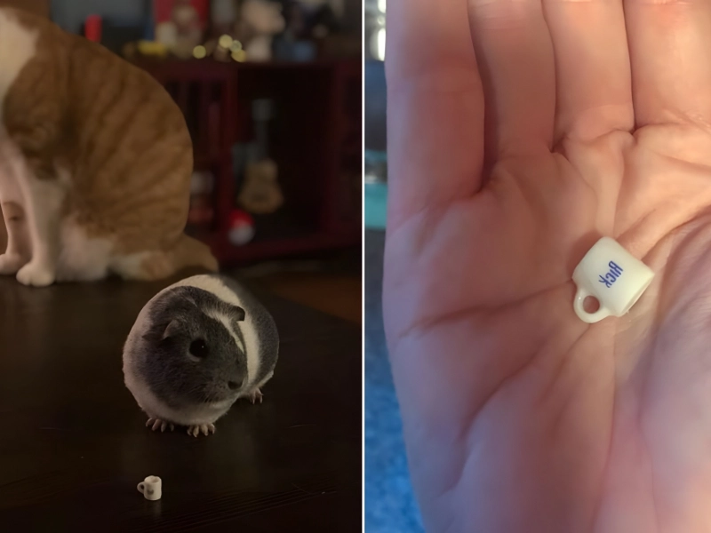 Pinterest/RRick の新しいマグ @DLazuara 投稿の残りの部分には、かわいいサイズの比較がいくつか含まれており、役に立ちました。その小さなカップは、ペットのモルモットが隣に置いたとしても小さすぎて飲むことができませんでした。彼は、興味のない猫の隣にカップとモルモットを持ってポーズをとっていました。