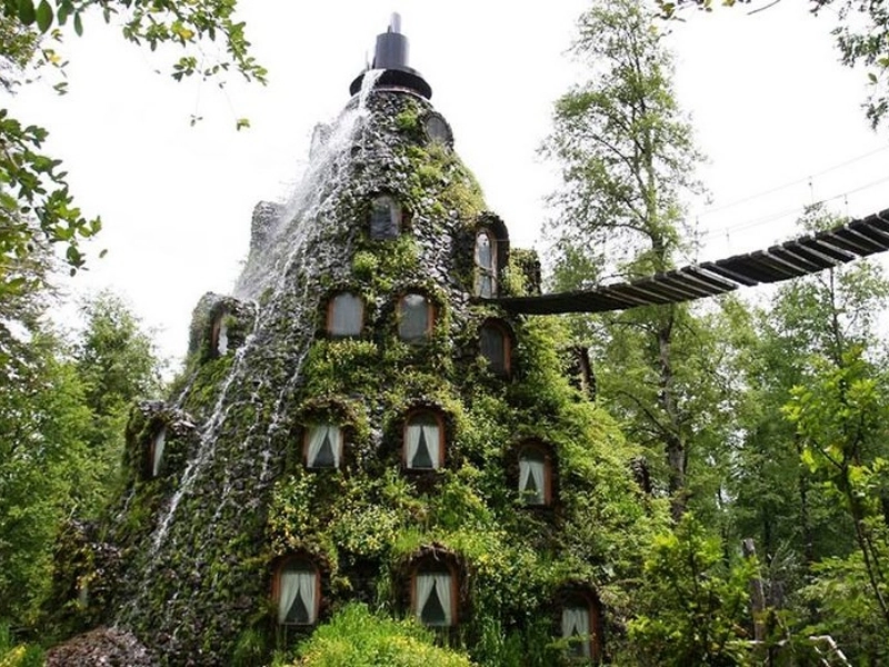 この幻想的な火山のようなホテルは、巨大な私有自然保護区の中心部にひっそりと佇み、溶岩の代わりに水を噴出させます。徒歩でのみアクセス可能で、中に入るには揺れるロープの橋を渡る勇気が必要です。