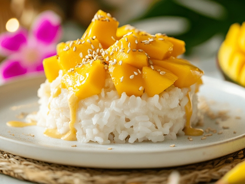 Perfectly ripe mangoes presented atop warm coconut sticky rice make up this famous Thai delicacy. The preparation consists on carefully choosing the best mangoes and boiling sticky rice with coconut milk until it has the ideal consistency. Rich coconut cream sauce and few roasted mung beans or sesame seeds then cover the rice. Every dish blends the warm, creamy rice with the sweet, aromatic mango to provide a harmonic mix of tastes and temperature range. The simplicity yet gratifying mix of fresh fruit and warm rice—enhanced by the richness of coconut milk—helps to explain the dish’s appeal. Although chefs sometimes add their own flavor by using different kinds of mangoes or pandan essence, the traditional combo stays a treasured staple throughout Southeast Asia. The dish is as Instagram-worthy as it is delectable because of its visual attractiveness—vibrant yellow mangoes on pearly white rice.