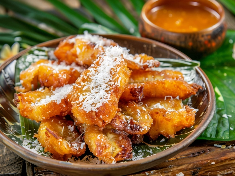 This well-liked street food dish transforms the lowly banana into a crispy, sweet delicacy. Dipped in a specially seasoned batter created from rice flour, coconut milk, and a little of turmeric for color, ripe bananas Deep-fried until golden brown and crispy, the fritters are presented beside a liberal drizz of palm sugar syrup. Some recipes call for sesame seeds as a garnish or in the batter to provide nutty taste and texture. The greatest ones strike the ideal mix between the soft, caramelized banana within and the crunchy outside. With its deep caramel notes balancing the bananas’ inherent sweetness, the palm sugar syrup gives still another level of complexity to the flavor profile. The simplicity, cost, and pleasing mix of flavors and textures of this delicacy help to explain its appeal. Night markets and street food vendors all throughout Southeast Asia often feature it.