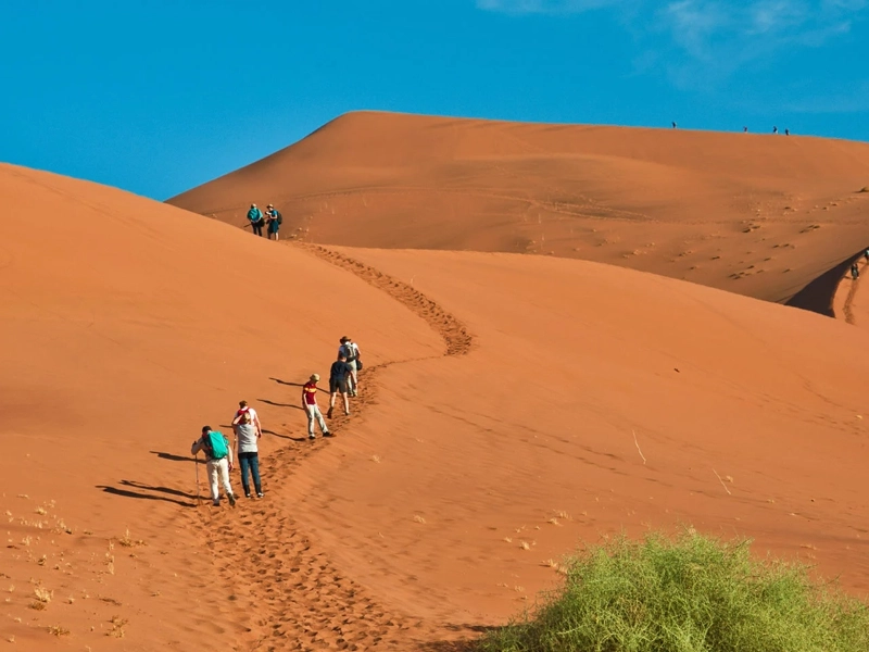 Deadvlei, a white clay pan studded with the charcoal skeletons of ancient camel thorn trees, lies deep in the desert. These 900-year-old tree remains produce one of the most strange scenes on Earth. The sand dunes cut off their water supply and the trees perished when the temperature increased; instead of rotting, the arid climate protected them by scorching the trees. A photographer’s paradise is created by the contrast among the black trees, white salt pan, rust-red dunes, and deep blue sky. These trees are amazing; they are too dry to break down, thereby acting as natural mummies silently attesting to the environmental changes of the desert over ages.
