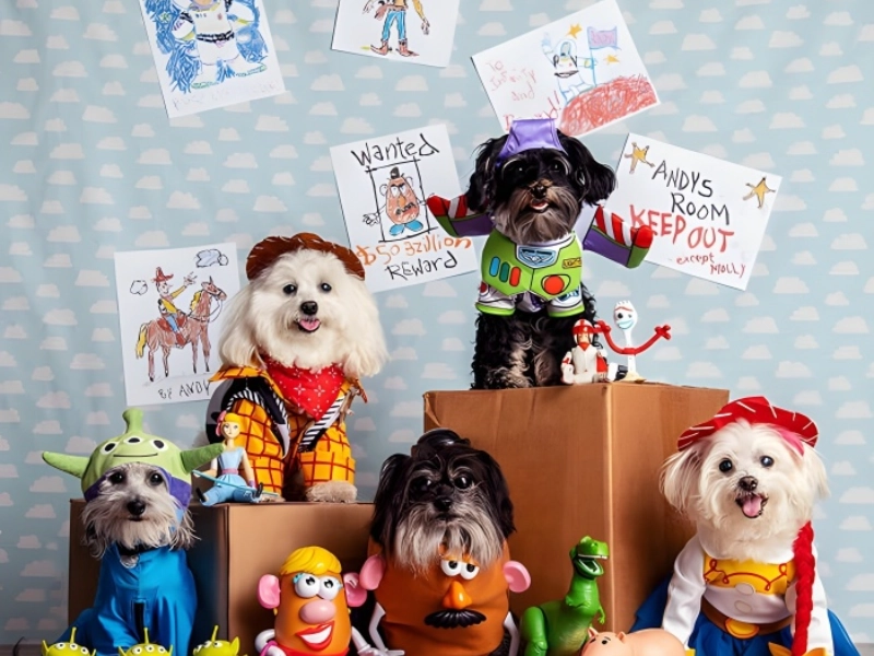 The height of canine Halloween cooperation is shown in this amazing group costume including several dogs costumed as cherished Toy Story characters. Every dog has been carefully chosen to fit their canine persona while yet capturing the core of the animation characters with their clothing. With every element from the cowboy hat to the boots exactly scaled for its four-legged wearer, the outstanding Woody costume steals the show. Jessie’s persona comes alive through another dog’s amazing costume and especially happy demeanour, demonstrating that occasionally the casting is just meant to be. Each costume has an amazing degree of detail, reflecting great thought on the comfort of the dogs wearing them as well as the original characters. Not only is the quality of the costumes excellent, but this group costume also shows great accomplishment in getting several dogs to pose together amicably for the picture. This degree of cooperation and patience shows the photographer’s commitment as well as the remarkable training of these fuzzy performers.