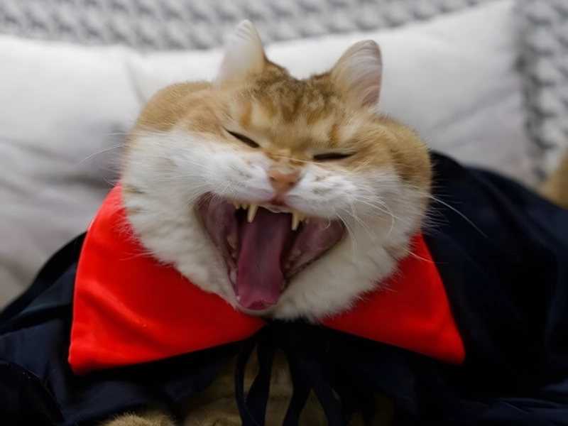 With wonderful effects, this cleverly designed costume flips the conventional Halloween cat cliché on its head. Rather than people masquerading as cats—a Halloween classic—this imaginative pet parent has costumed their feline pal as a vampire with striking fangs. The costume’s appeal comes from its ideal mix between eerie and beautiful; the dramatic vampire aspects accentuate the cat’s innate predatory traits. Especially remarkable in their scale and location, the fangs provide an unexpected dimension of exotic terror to the classic vampire costume by paralleling the look of a cobra. The meticulous attention to detail in matching the costume to the natural characteristics of the cat reveals deliberate thought and preparation. This outfit is particularly amazing because it transforms the cat into a convincing supernatural creature while yet preserving their dignity. While highlighting the pet’s innate grace and enigmatic character, the finished product offers an interesting remark on the interaction between cats and Halloween customs.