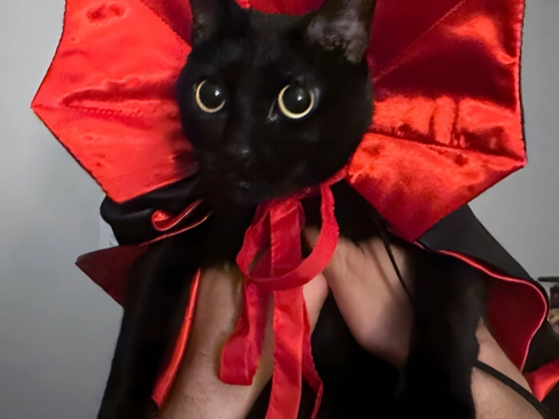 Count Catula, a feline variation of the well-known vampire that manages to be more appealing than terrible, is introduced to us in this lovely reinterpretation of the original Dracula figure. The costume’s success comes from its ideal mix of eerie details with the cat’s naturally beautiful traits, especially those mesmerising eyes that seem to be the opposite of classic vampire threat. The costume design exhibits remarkable attention to detail, combining classic vampire motifs to ensure they accentuate rather than overwhelm the cat’s innate appeal. This interpretation is especially clever because of the fun implication that the cat’s innocent look could be a clever trick, a throwback to vampire mythology where beauty is sometimes used to hide menace. The costume explores our preconceptions of both vampire tales and normal cat behaviour on several levels. The outcome is a Halloween costume that proves that the most terrifying of supernatural monsters can be turned into something lovely when seen through a feline perspective. It manages to be equally complex in its idea and very beautiful in its execution.