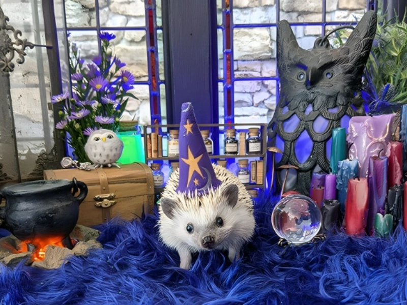 This amazing metamorphosis of a hedgehog into a small wizard questions conventional spooky season clichés and opens fresh ground in pet Halloween costumes. The costume deftly combines magical components to accentuate the hedgehog’s inherently appealing look, therefore producing an enchanted juxtaposition between the conventional idea of magical wizardry and the pet’s own appeal. Scaling down magical accessories to hedgehog size requires great imagination and workmanship based on minute detail. The way this costume pioneers Halloween representation for a pet species not usually connected with the festival makes it very unique. The hedgehog’s natural expression of innocent enjoyment gives the enigmatic wizard character an interesting twist that implies this small spellcaster might be more fascinated in spreading happiness than in producing evil potions. While illustrating that any pet, regardless of breed, may join in the holiday celebrations with flair, the general impact effectively shows that Halloween costumes can be unique and appealing without losing their magical character.