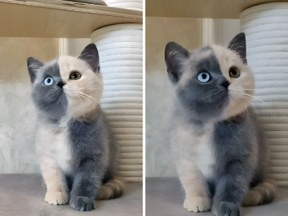Within the interesting realm of unusual animals, there is a really lucky owner living with this amazing two-tone kitten. Originally posted online, the pictures of this extraordinary cat went viral right away and captured the curiosity of spectators all across. Although heterochromia—different coloured eyes—is very frequent in cats, this particular specimen shows something quite unusual: a perfect bilateral divide in its fur colouring that runs from its face down through its body, producing almost perfect split appearance past her neck. Many first suspected digital tampering since the accuracy of this division is so amazing. Experts in the comments section, however, offered a scientific justification—that this unusual look could be the result of a genetic occurrence called chimerism, in which two distinct cell populations coexist in one organism. Early development witnesses this rare genetic event when two fertilised eggs merge to produce one individual with two different genetic profiles. The end effect is an amazing display of natural artistic ability that produces what seems to be two separate cats combined into one ideal specimen.