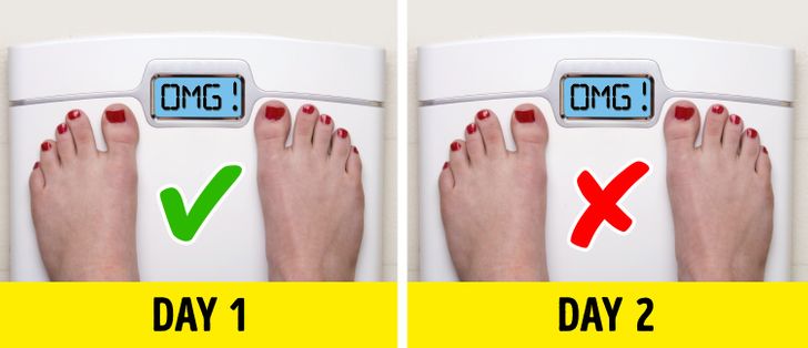 Do this instead: try using a tape measure around your waist, hips, and thighs to track your progress once a week. If you really need to weigh yourself to keep yourself motivated, do it no more than once a week or even once every 2 weeks.