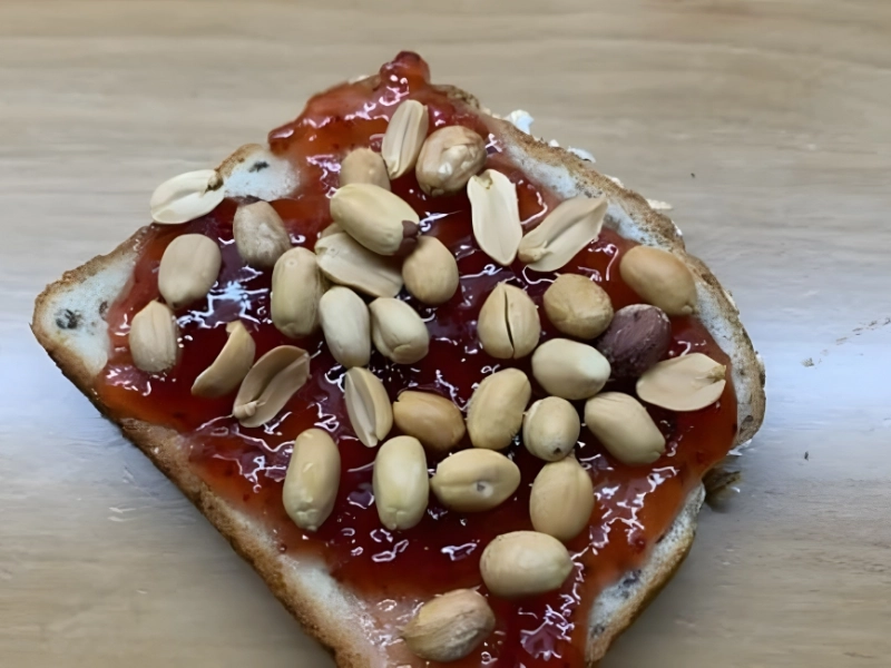 This sandwich basically consists of peanut butter and jelly. A piece of bread with jelly or jam on it is shown, and a variety of peanuts are placed on top. This is a PB&J technically, but that’s more a matter of utility than style.