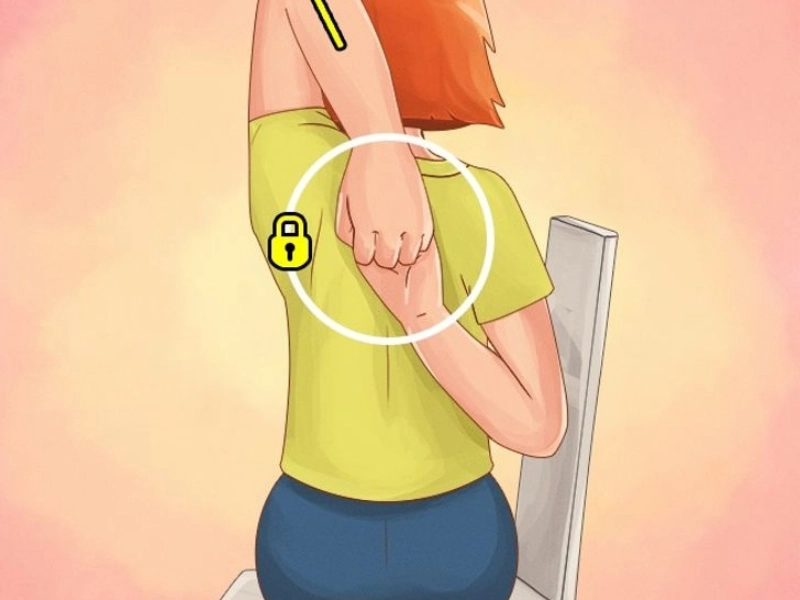 One arm should be behind your back. Lift the other one and position it close to your elbow-bent shoulder blades. Pull the elbow of your upper arm up and clench your hands together in a lock. Five seconds later, swap hands.