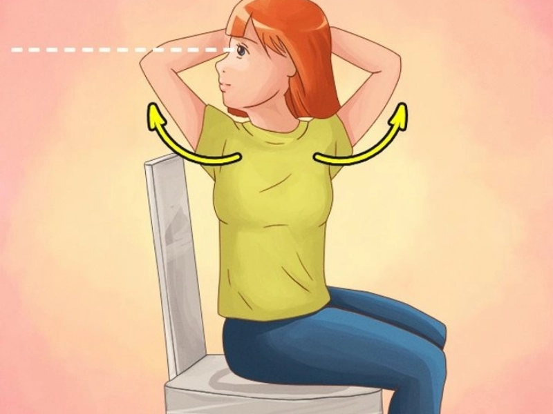 Put your hands behind your head and, without moving your lower body, swivel your upper body to the left until your shoulders form a right angle with the chair’s back. After remaining in this position for 5 seconds, turn right.