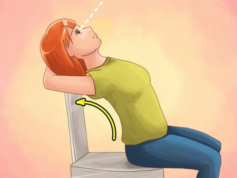 Put your arms behind your head as you lean back in a chair. Look up toward the ceiling while bending at the spine. Pull your head back gradually until it touches the chair’s back while keeping your eyes up.