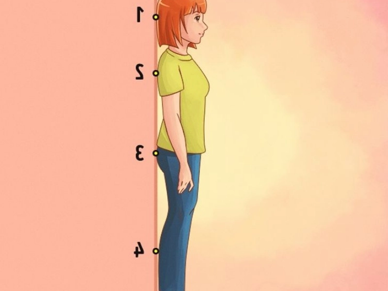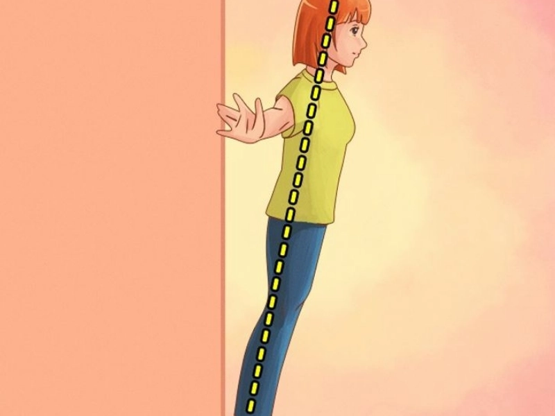As in the illustration, get to your feet. Make sure both of your shoulder blades, buttocks, and calves can feel the wall. Exercise your core while taking numerous deep breaths in and out.
