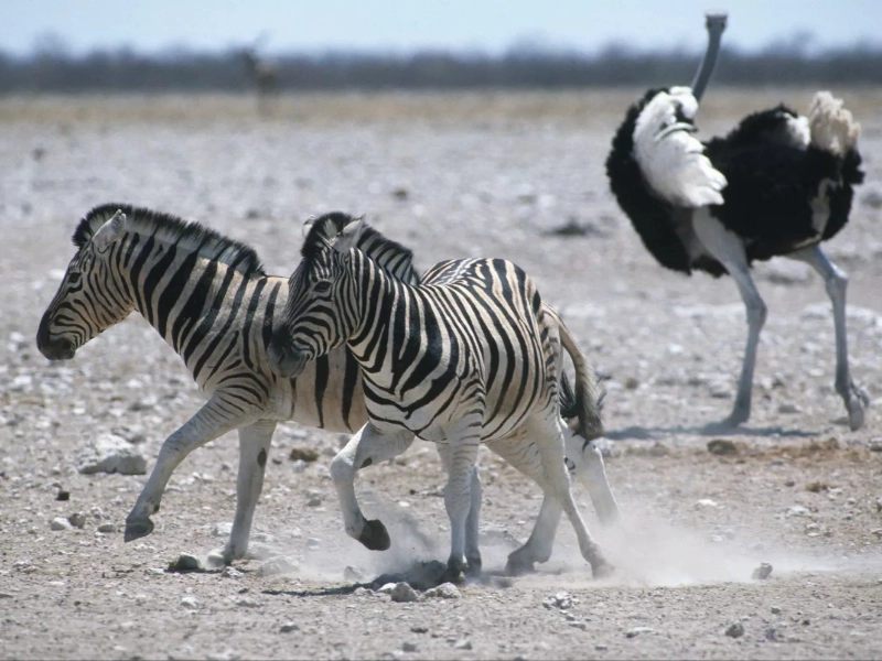 Zebras and ostriches frequently graze together when close to one another, therefore using their respective advantages. They remain vigilant to their surroundings while they search for food, depending on their integrated senses to be safe. When a zebra sees a possible threat, it can rapidly let the ostrich know so that both animals may flee. On the other hand, an ostrich’s keen sense of smell allows it to warn the zebras of a predator, therefore guaranteeing that both species remain awake.