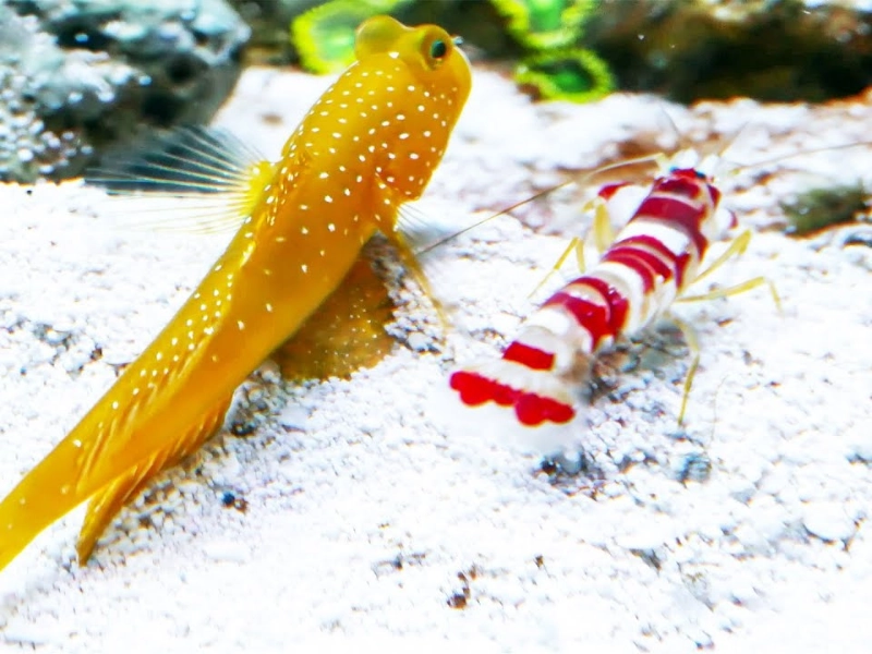 Gobies have developed to see pistol shrimp and sometimes use their burrows. For both species, these burrows the shrimp dig in sandy substrates offer a refuge. Using its better vision to spot possible hazards, the goby serves as a lookout for the shrimp. The goby can warn the shrimp when danger is close by maintaining its tail fin in touch with the antennae of the shrimp. The shrimp can hide inside the safety of their burrow before a predator can attack, hence this communication is absolutely vital.