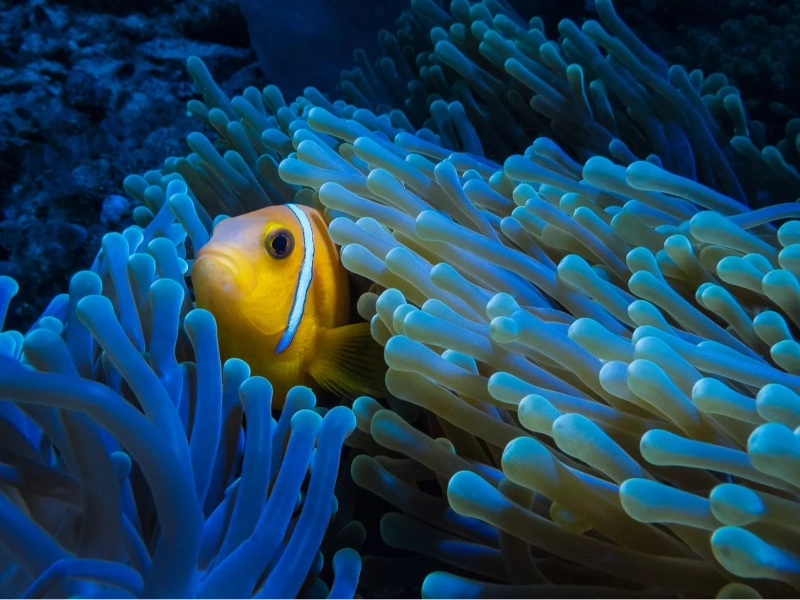 By giving clownfish a safe refuge, sea anemones help them to avoid predators that might otherwise be quite dangerous. In turn, the clownfish have evolved a special adaption that helps them to dwell with the anemones free from stings. On their skin, they secret a unique mucus that acts as a barrier against the nematocysts of the anemone, the stinging cells typically harming other fish. This modification lets clownfish move freely among the anemone’s tentacles, therefore providing a secure refuge from predators.