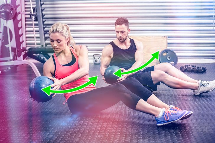 Sit upright, then bend your knees and tilt your back slightly backward; Hold a medicine ball near your chest, in the center; Twist to your left taking the medicine ball to that side; Return to the center and repeat on the right side.