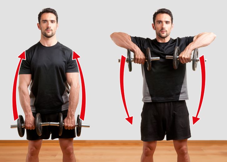 Start by squatting down and bending slightly, keeping your back straight; Place a dumbbell in each hand with your arms in front of you, palms facing each other; Bend the elbows slightly; Lift the arms up and out to the sides, keeping them in line with the shoulders; Return the arms to the starting point.