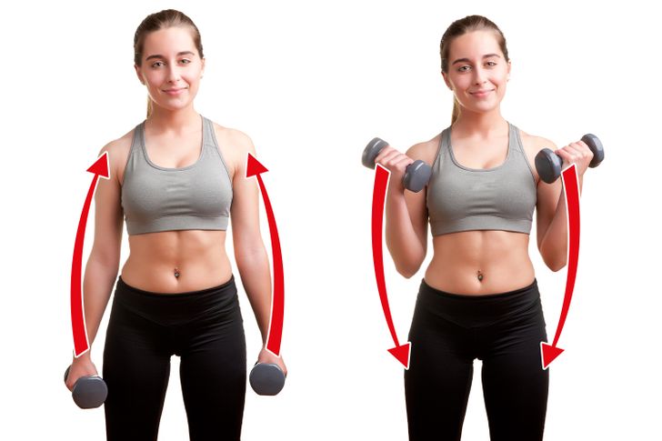 Note: Adjust the dumbbells’ weight to the point that you can hold them steady and control the up and down movements.