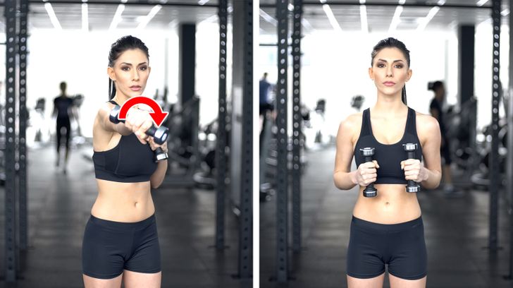 Start by standing with your feet hip-width apart, keeping your back straight; Hold a dumbbell in each hand in front of you, palms facing your legs; Lift the dumbbells up until they are near your chest and your elbows make a straight line with your shoulders; Return to the initial position.