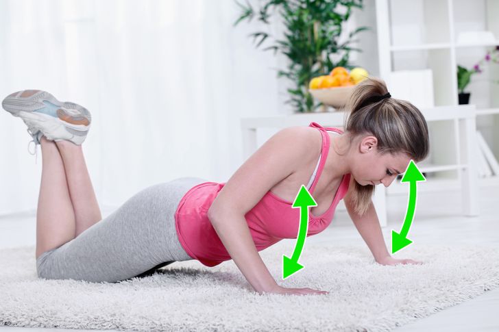 This exercise works on your entire upper body. It targets chest muscles, shoulders, biceps, and abs.