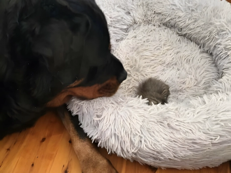 Large dog breeds—especially Rottweilers—have false preconceptions that may eclipse their really gentle and caring temperament. This poignant picture is a great tribute to the caring soul hidden inside some badly misused dogs. When seeing a defenceless stray kitten, this Rottweiler’s natural reaction was not apathy or hostility but rather a quick show of protective instinct and delicate care. The picture shows hours of focused attention as the big dog keeps a protective posture around its small new friend, therefore providing a safe environment for the scared kitten to relax. This behaviour is not only adorable but also a great example of how often size and breed preconceptions fall short in capturing the actual character of these amazing animals. Cats frequently grow up to assume leadership positions in mixed-species homes, regardless of size difference, hence the interaction between this unusual pair also suggests an interesting future relationship. This lovely moment of interspecies care and protection reminds us that the potential for tenderness sometimes comes in unanticipated packaging and helps challenge assumptions.