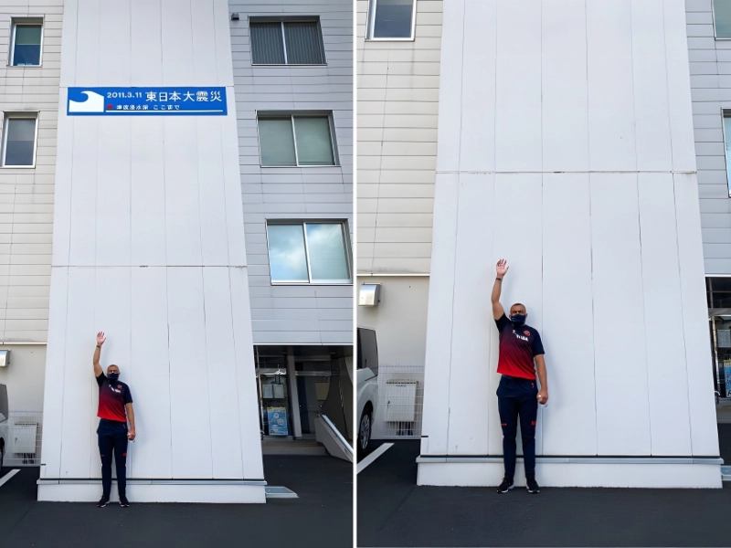 The location of the floodwaters during the devastating 2011 tsunami is marked by this blue plaque. This indicates that the water filled the building to the level of two stories on either side, submerging everything in its path. Whoa.